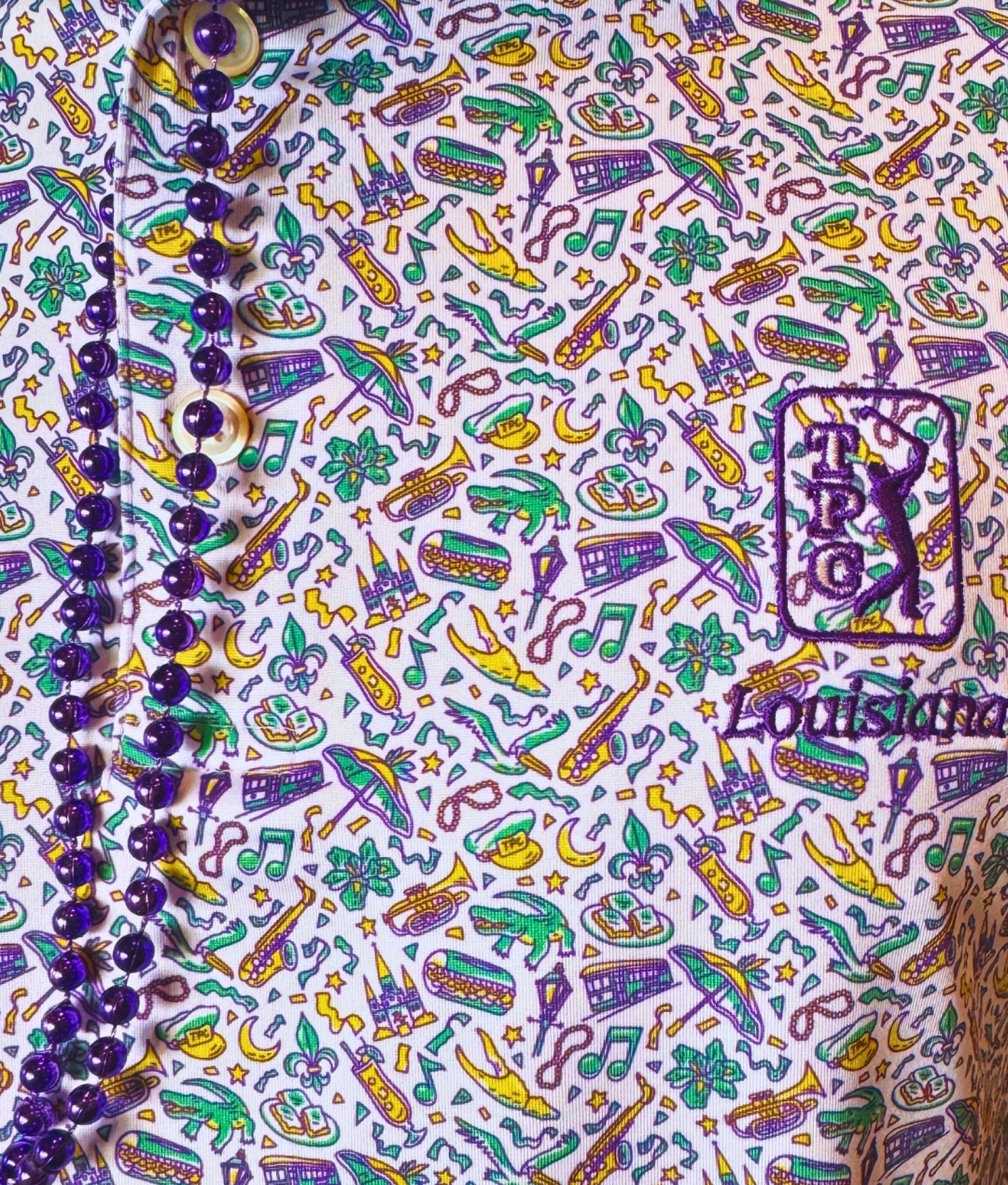 This New Orleans–themed polo customized by Alon Apparel for the TPC of Louisiana Pro Shop and golf course staff captures the spirit of Mardi Gras with vibrant purple, green, and gold accents woven into a playful, local-inspired pattern. Designed with performance in mind, the polo features lightweight, moisture-wicking fabric and 4-way stretch for all-day comfort and mobility. Polished enough for the clubhouse yet versatile enough for everyday wear, it transitions seamlessly from on the course to off, making it a standout piece that blends regional character with modern performance.