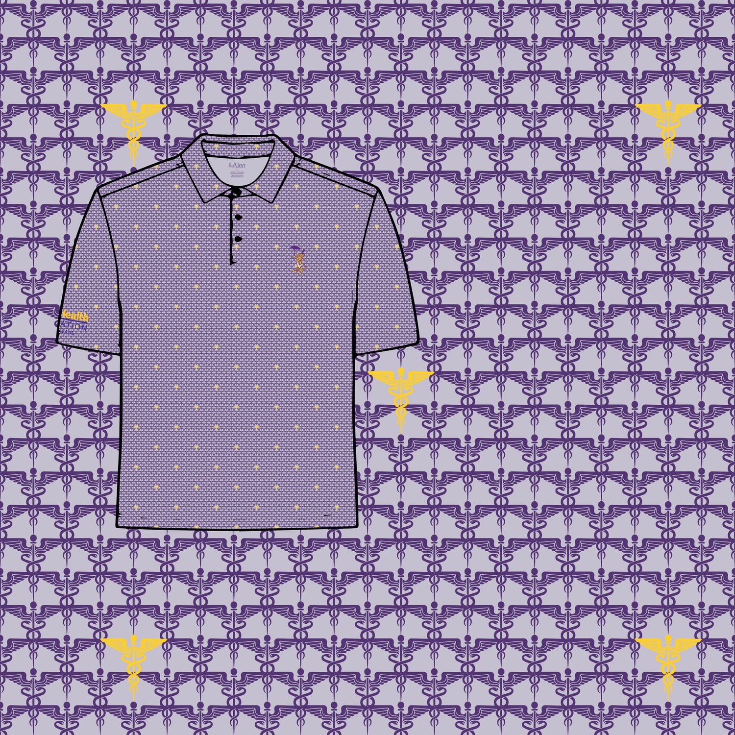 This custom LSU-colored caduceus patterned polo was designed by Alon Apparel for the LSU Health Foundation’s Golf Tournament taking place this March, blending school pride with a meaningful medical motif. Featuring a refined all-over caduceus pattern in LSU purple and gold, the polo delivers a polished look suited for tournament play and post-round events alike. Crafted from lightweight, moisture-wicking fabric with 4-way stretch, it offers breathable comfort and easy movement, making it a versatile performance piece designed to be worn seamlessly on and off the golf course.